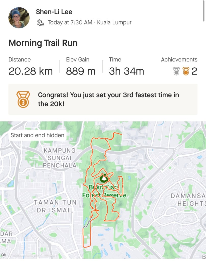 There were three water stops – the first after the 6km mark, the second after the 9km mark and the third after the 13km mark. My pace was dropping from the first water stop, but I could still continue even after the last water stop, even if it was a struggle at some parts. Perhaps it was because my watch was not calibrated and it showed that I only had 1+km left. As I walked and walked and navigated the more technical parts of the route, I started to feel more fatigued when the end was nowhere in sight. My pace was painfully slow but as long as I was still moving forward, I didn’t care if it was a snail’s pace.