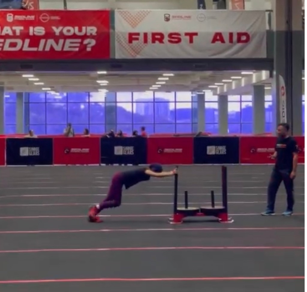 It was heavy. My form could have been better. My right arm was on the point of buckling every time I applied pressure to push. I was sweating buckets onto the carpet so the marshall offered to get me water. I think he was worried I might faint then and there. My sled moved… very slowly. Luckily, it was only one lap. I don’t think I could have done two.